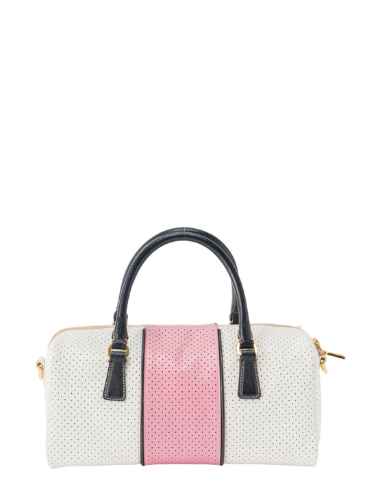 プラダ 三角プレート ミニボストンバッグ レザー ホワイト×ピンク×ブラック ゴールド金具