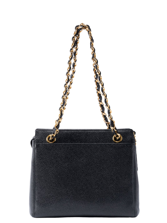 シャネル ロゴ チェーントートバッグ キャビアスキン ブラック ゴールド金具