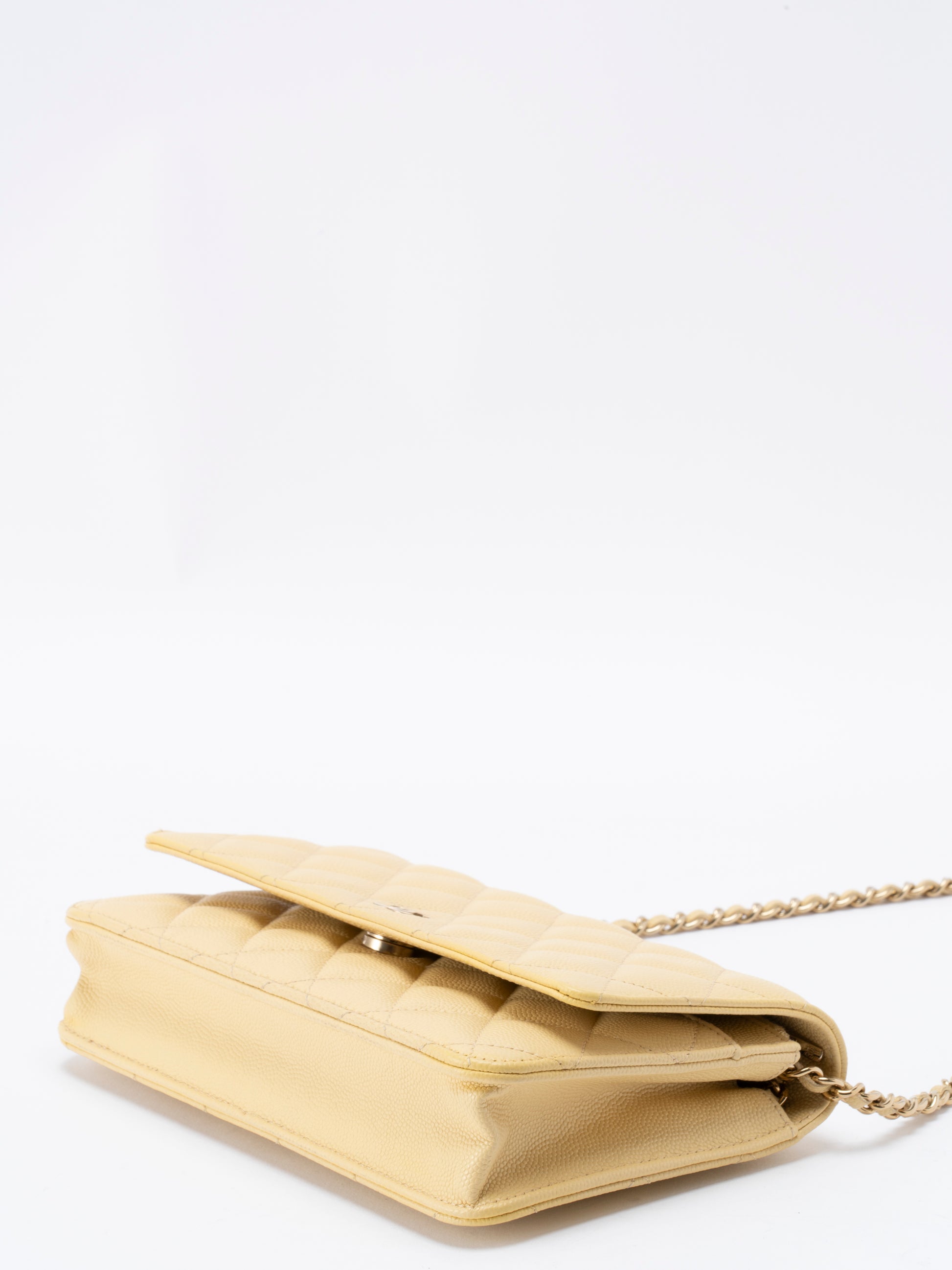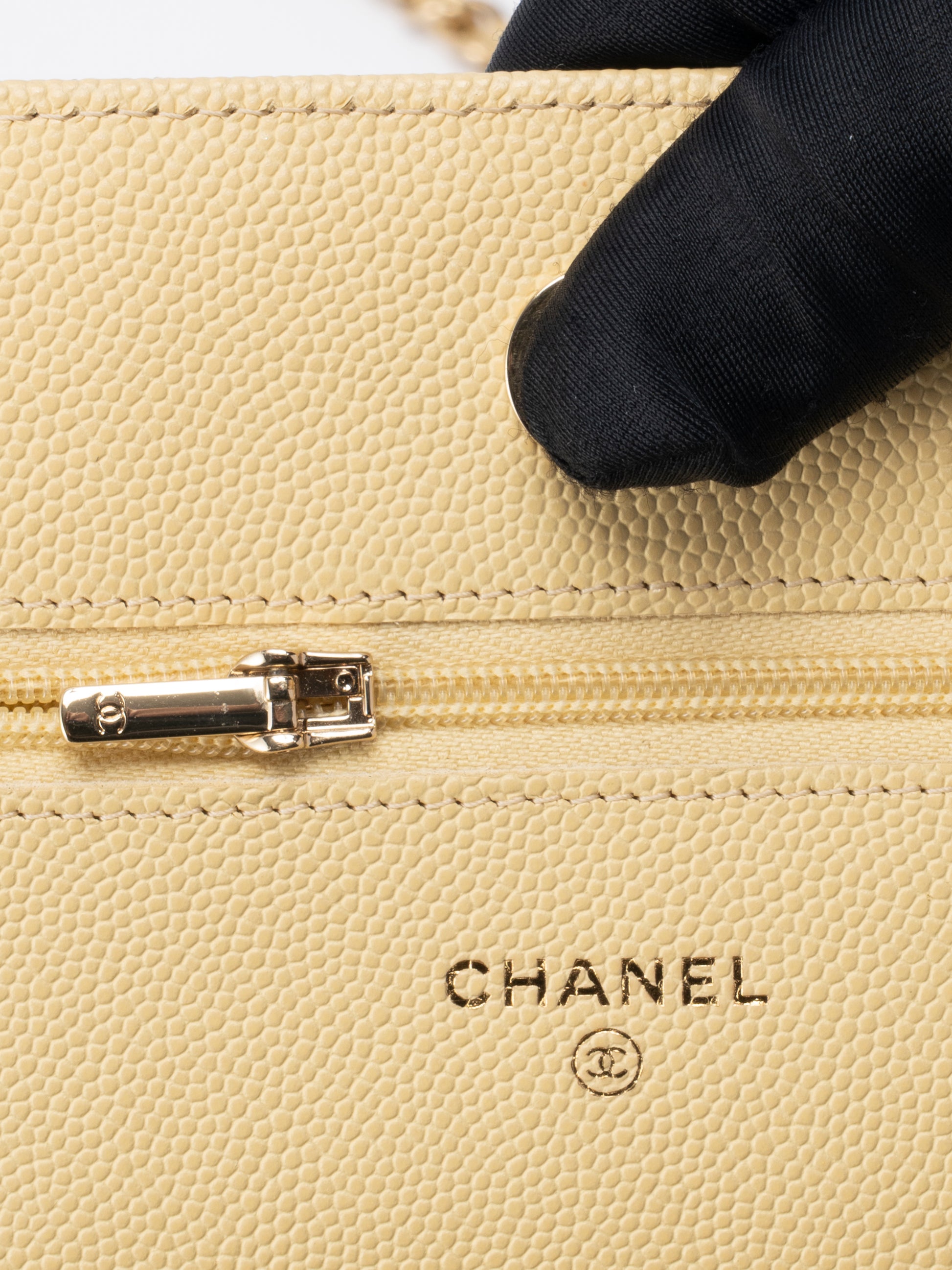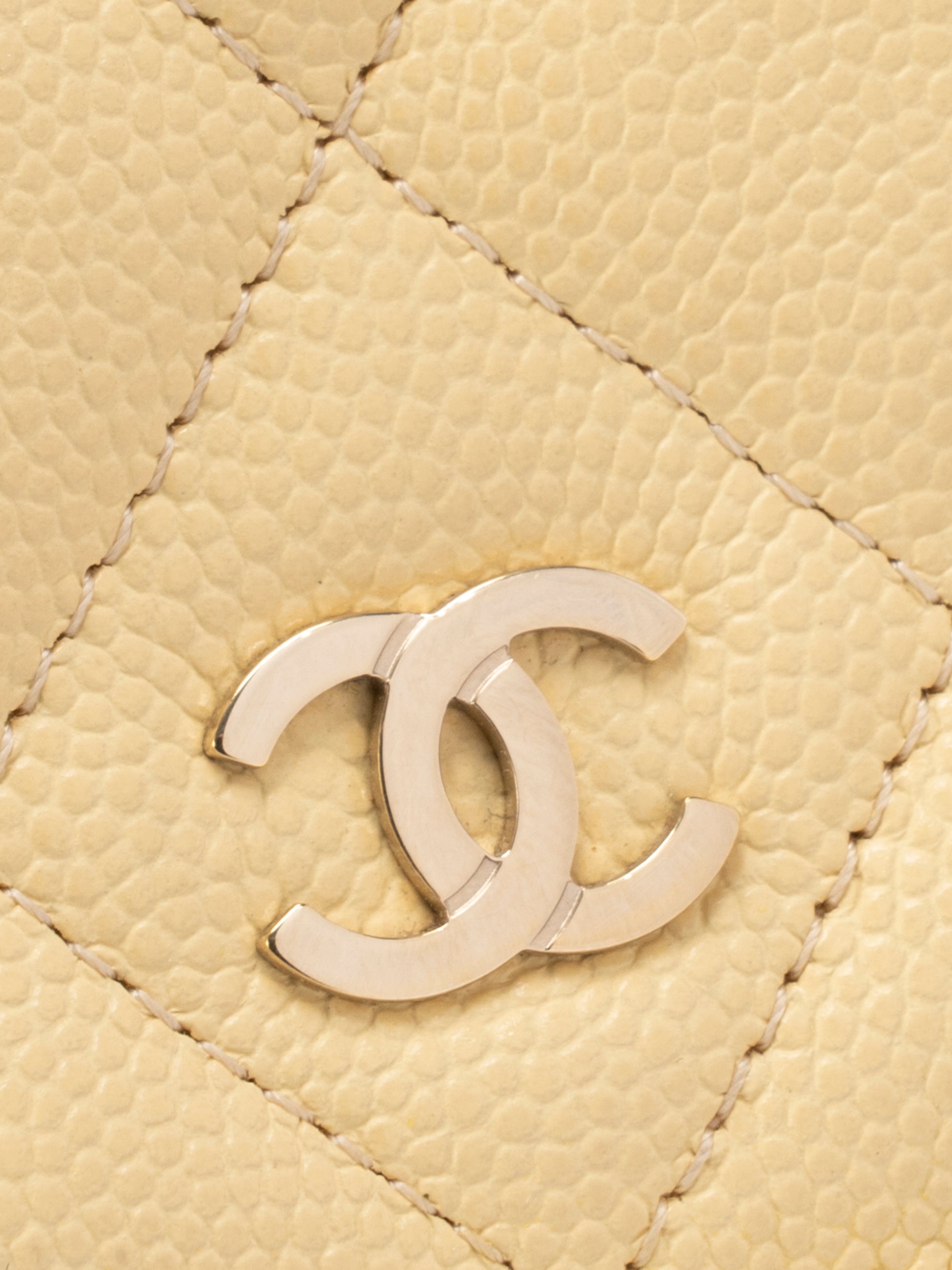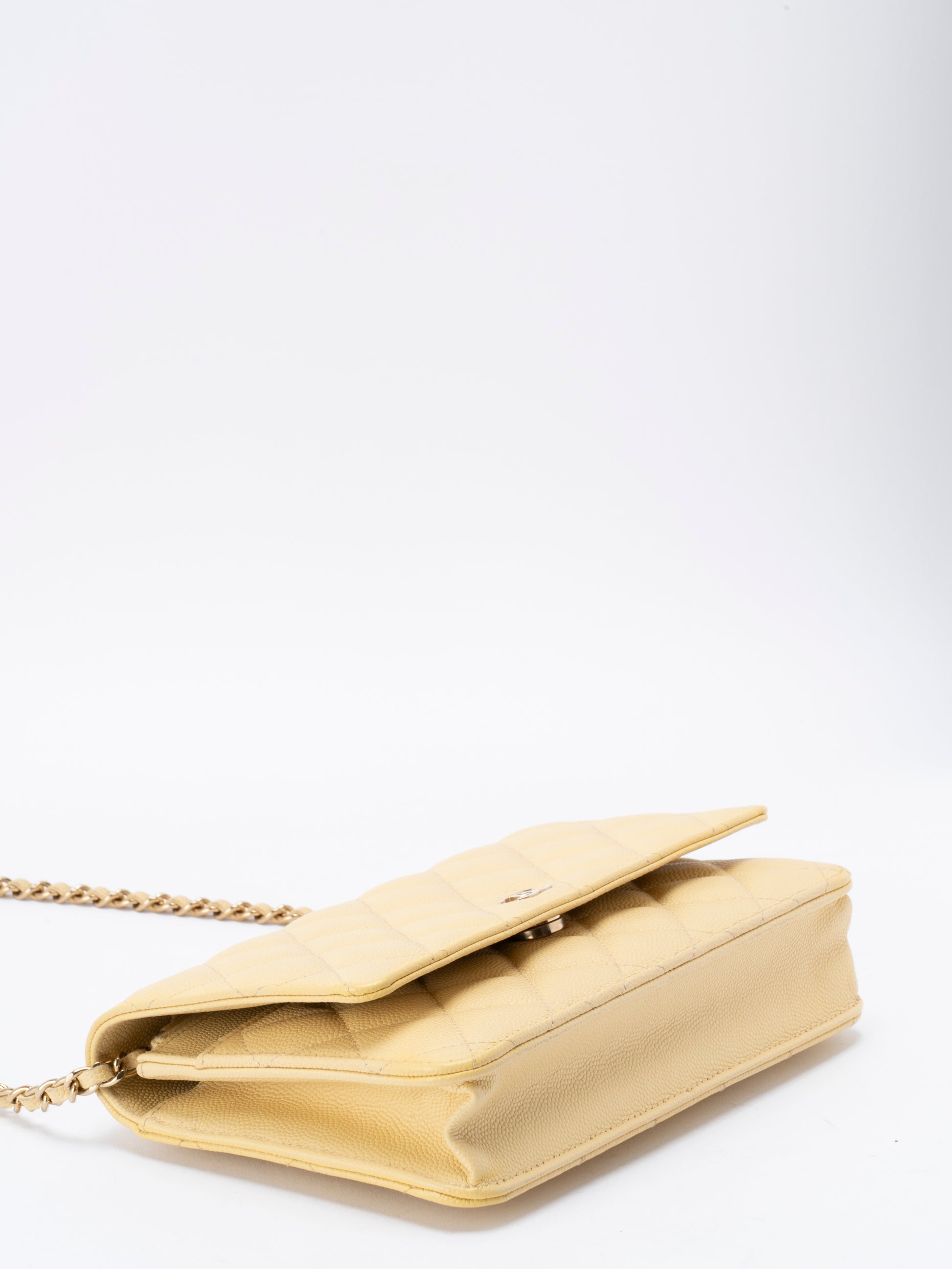 シャネル チェーンウォレット ターンロック シリアルプレート チェーンショルダーバッグ キャビアスキン イエロー ゴールド金具