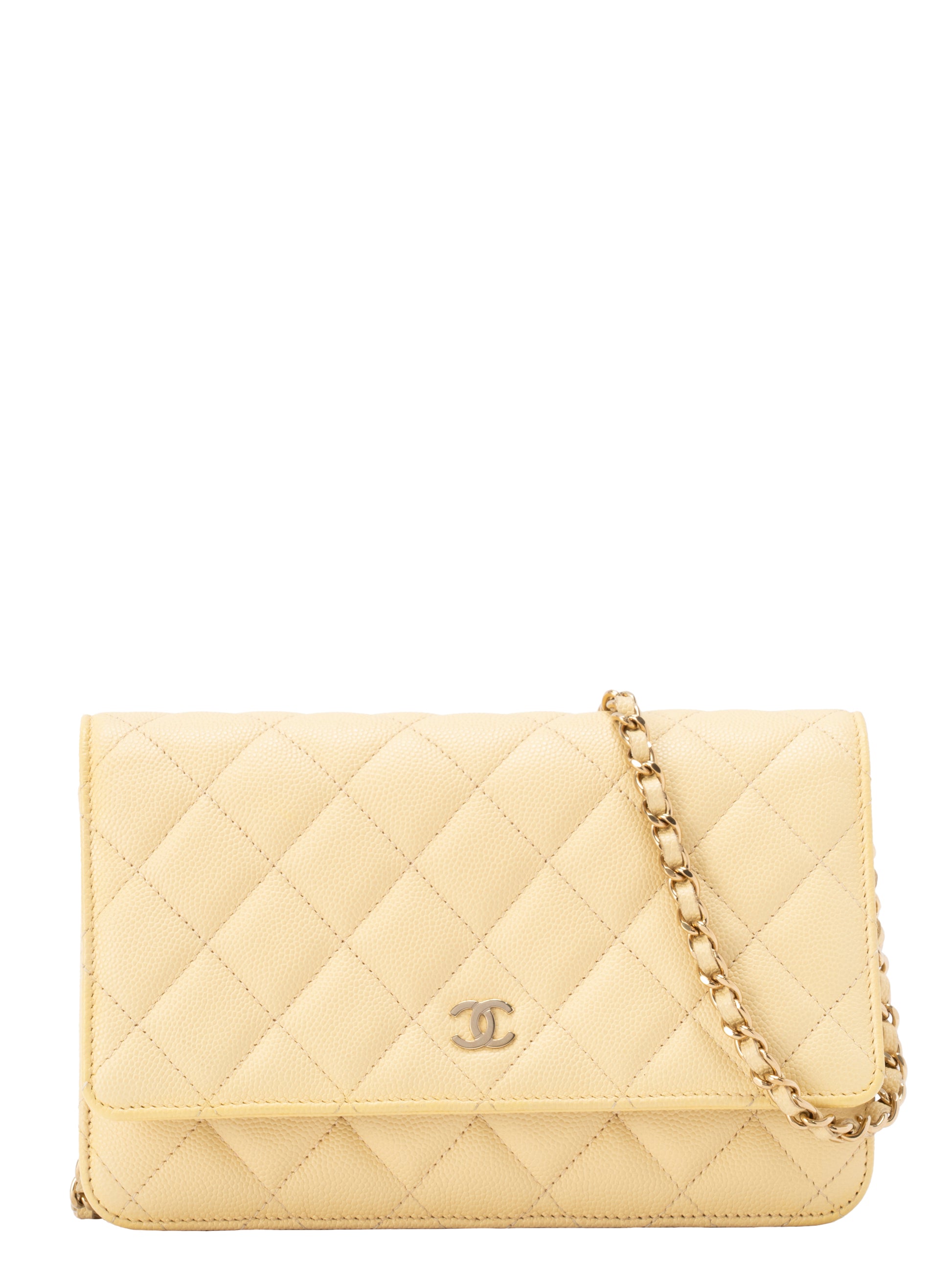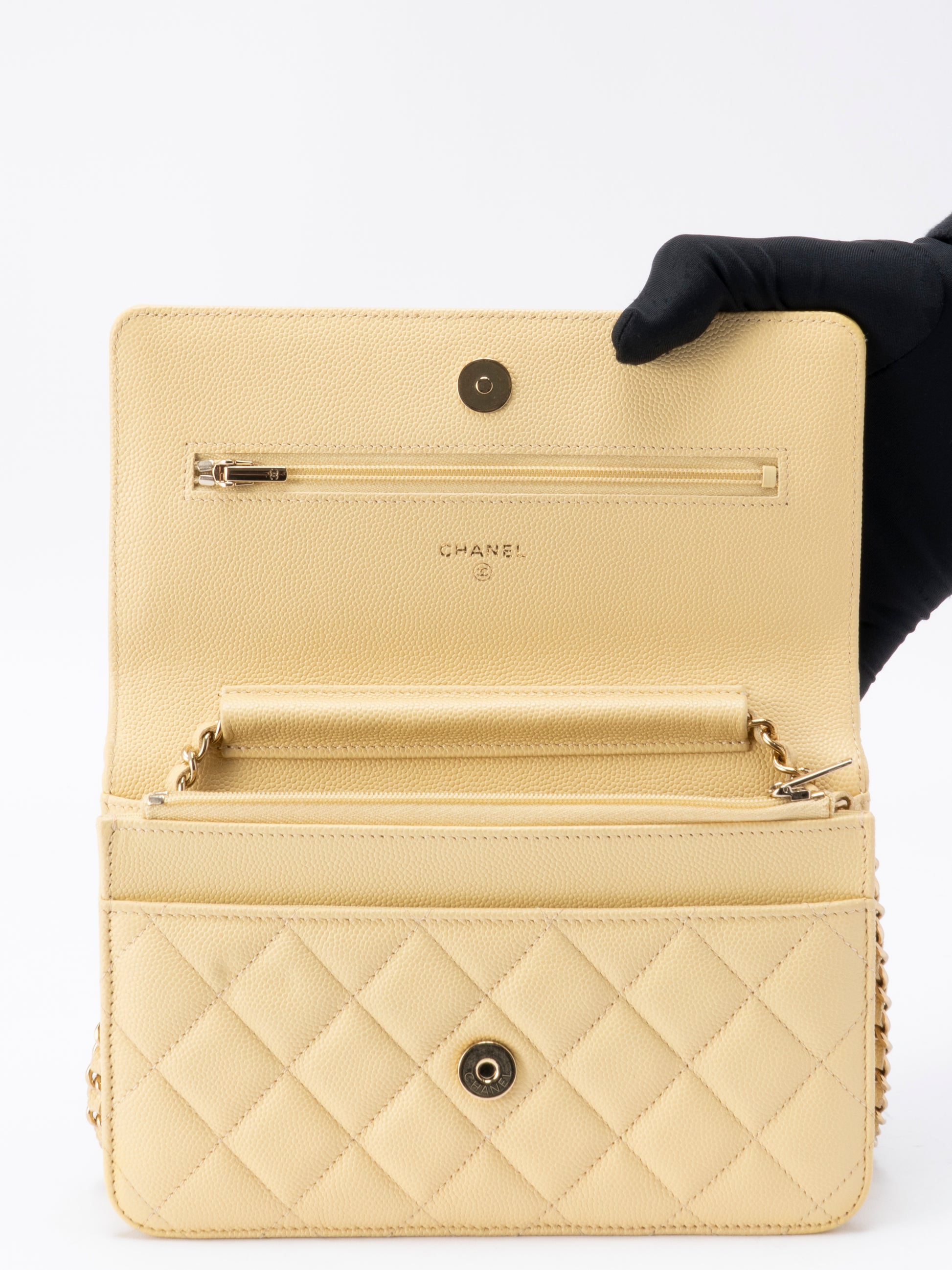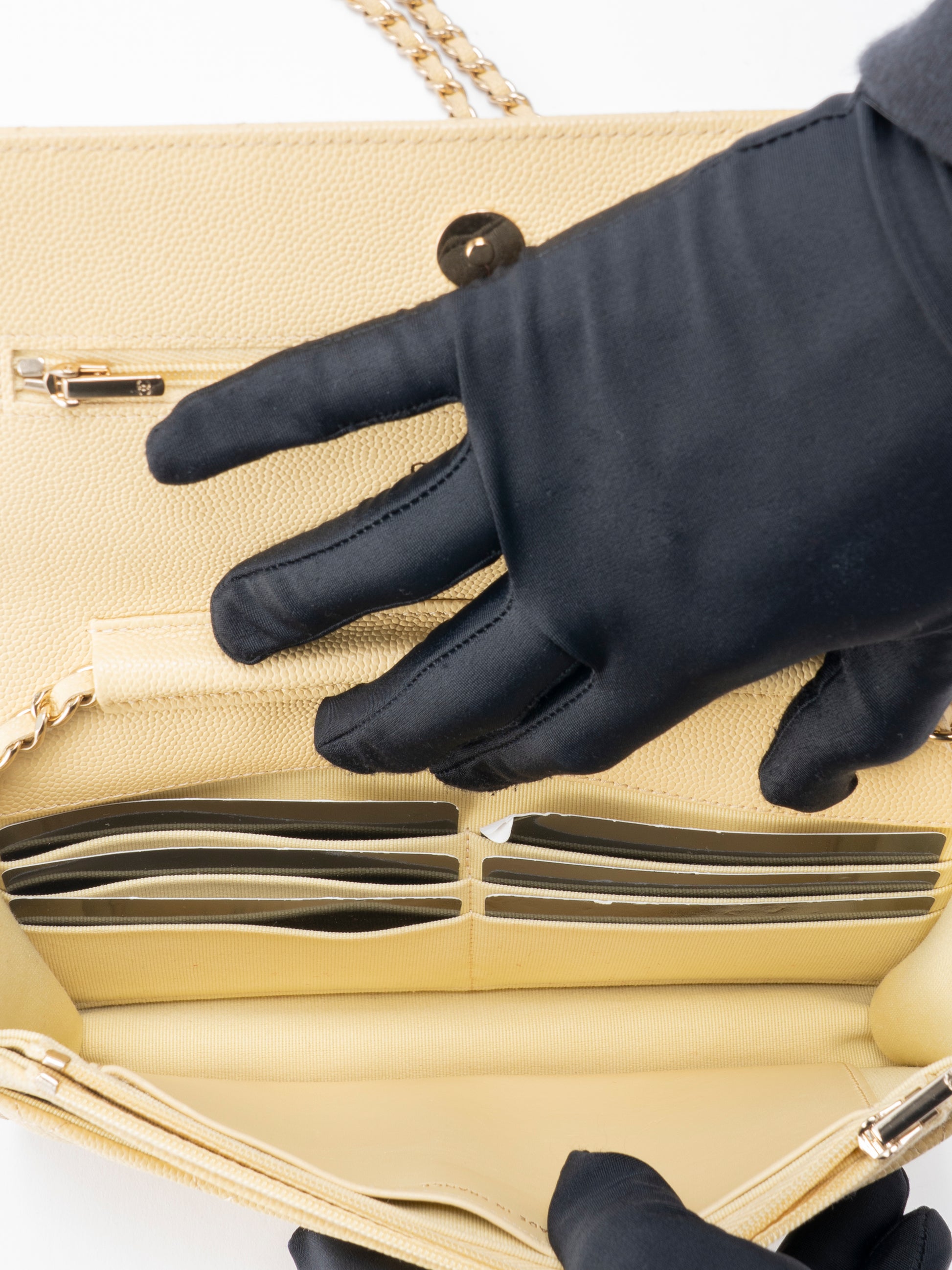 シャネル チェーンウォレット ターンロック シリアルプレート チェーンショルダーバッグ キャビアスキン イエロー ゴールド金具